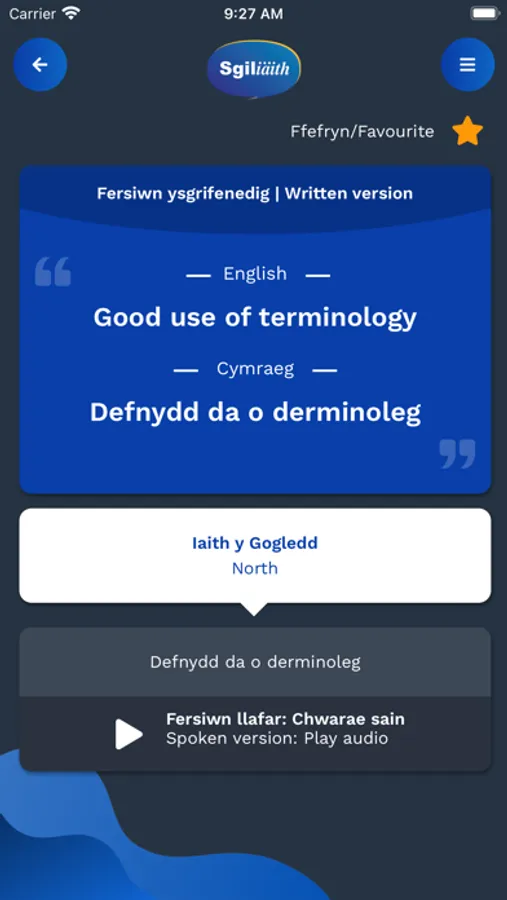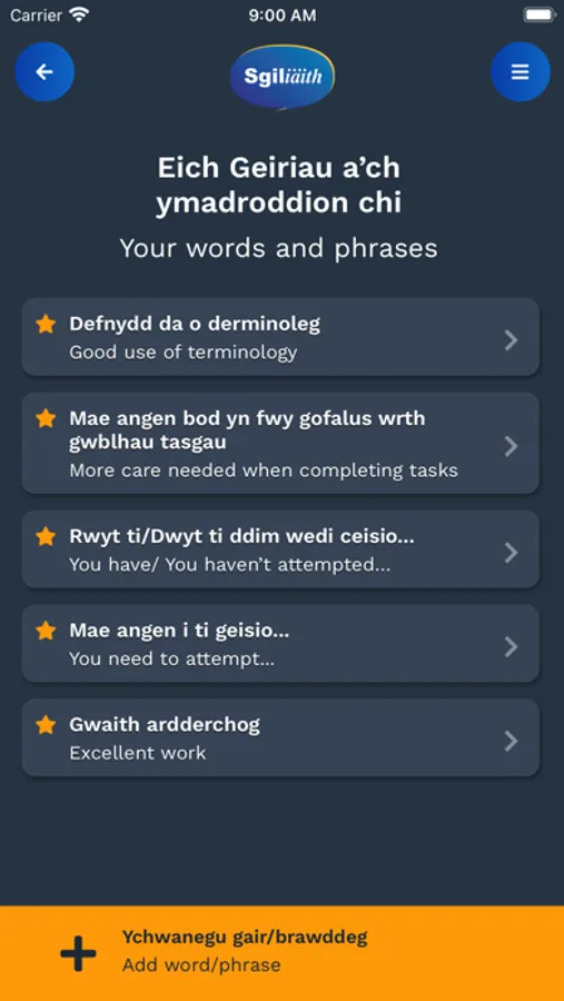 Mae’r ap yn galluogi defnyddwyr i gadw ymadroddion i’w rhestr ‘ffefrynnau’ er mwyn cael mynediad hawdd iddynt, yn ogystal â mewnbynnu ac arbed eu geiriau neu ymadroddion eu hunain i’w defnyddio yn y dyfodol.