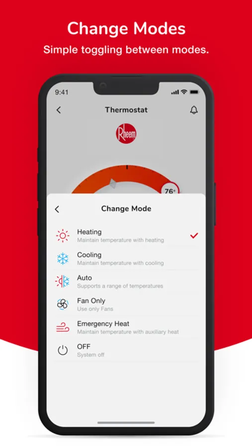 - Toggle easily between modes – including heating, cooling, fan, emergency heat and off settings