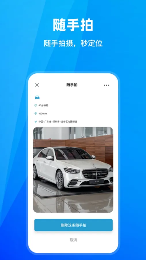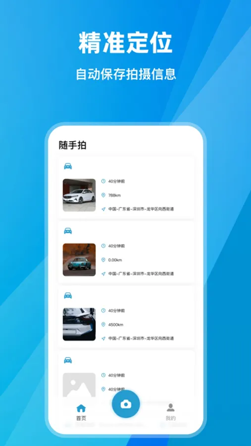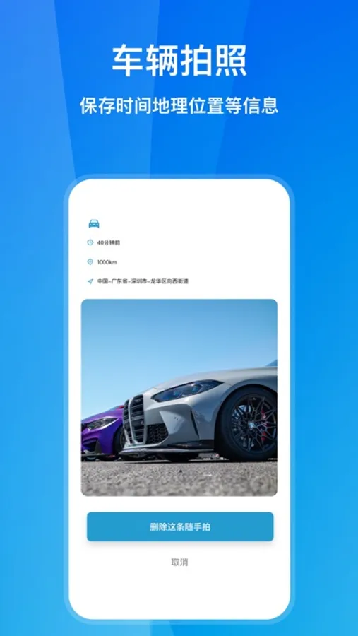 随手拍帮助您随时拍摄车辆照片及位置信息,并保存为本地照片。