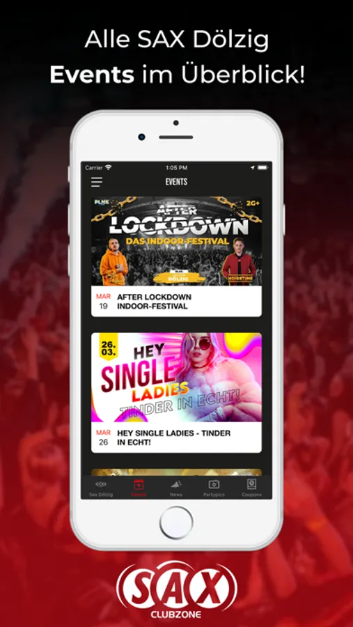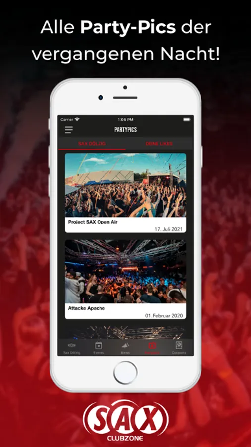 Du erfährst als erster, wann die nächste Party steigt und profitierst dabei noch von fetten Aktionen. Zum Event sparst du mit unseren Gutscheinen bares Geld. Damit du dich am Tag danach auch an den geilen Abend erinnern kannst, stellen wir alle Party-Pics in der App bereit.
