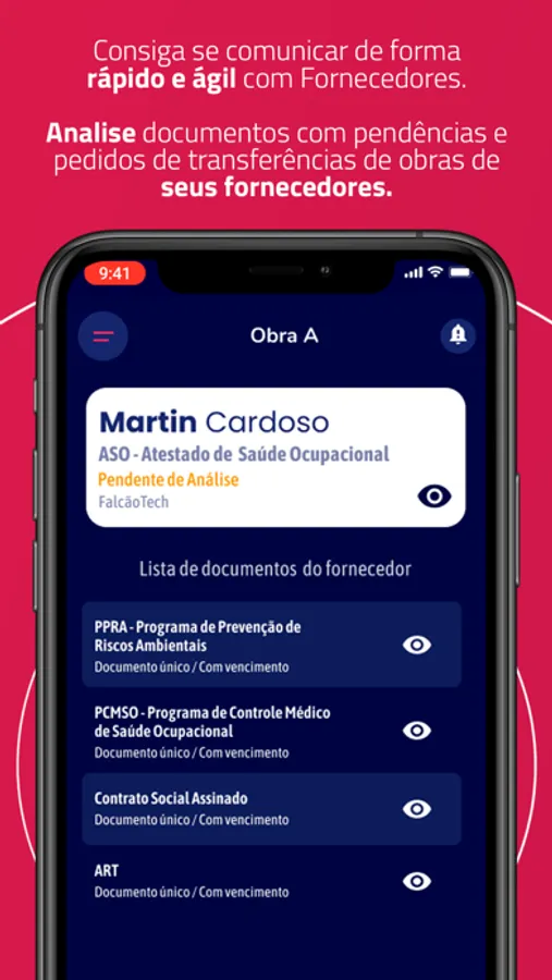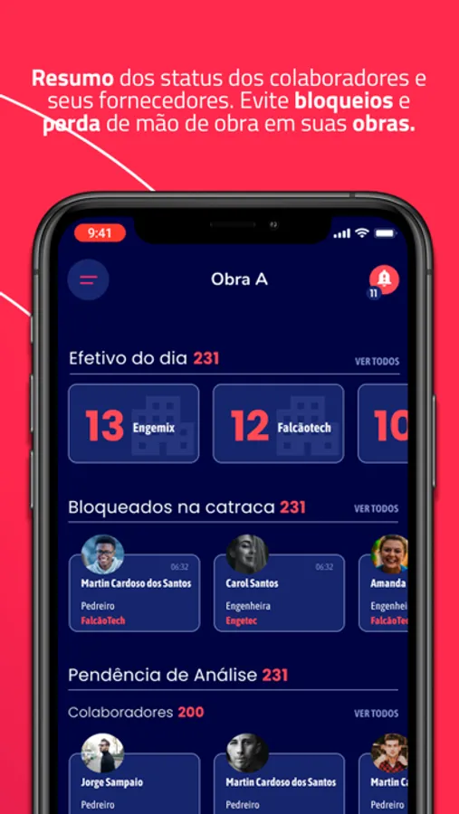 Pelo aplicativo você conseguirá uma ampla visão dos colaboradores e fornecedores que estão em suas obras, com a possibilidade de solucionar e prevenir seus bloqueios e pendências.