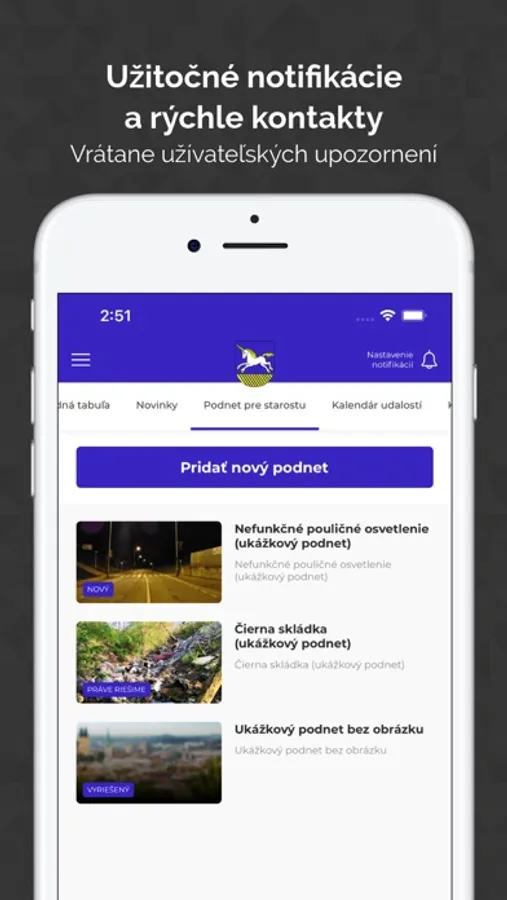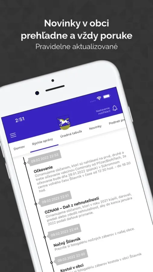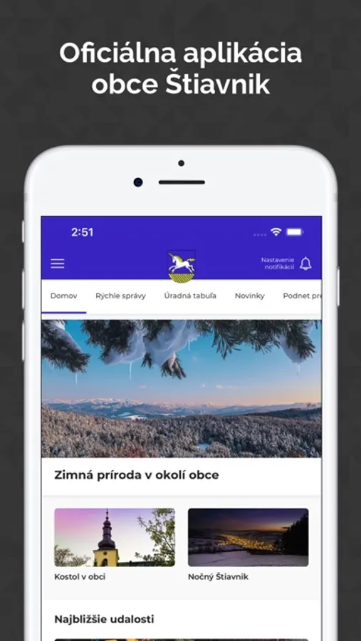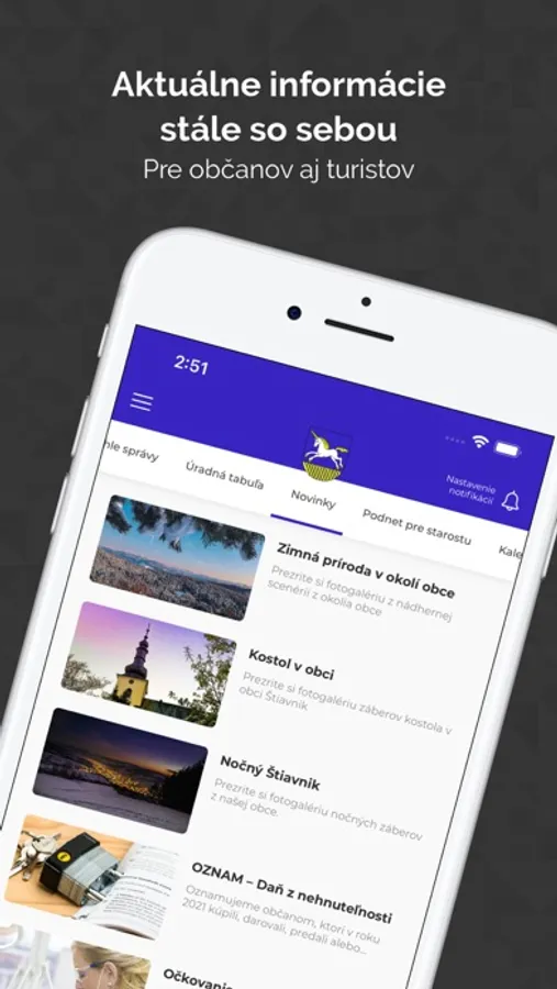 Mobilná aplikácia obce Štiavnik. V aplikácii nájdete aktuálne informácie z diania v obci, kalendár, dôležité kontakty aj top lokality. Môžete si nastaviť upozornenia na rôzne udalosti, od noviniek, cez udalosti kalendára až po denné sumáre. Obec Vám v prípade kritickej situácie (napr. povodne) môže poslať upozornenie priamo do aplikácie.
