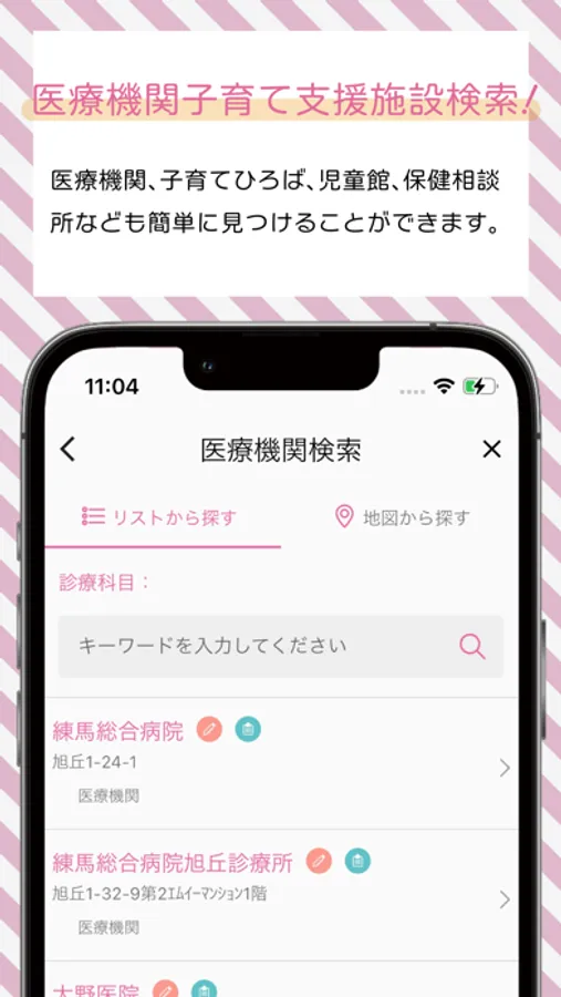 医療機関や子育てひろば、児童館、保健相談所なども簡単に見つけることができます。