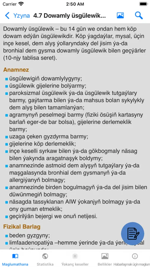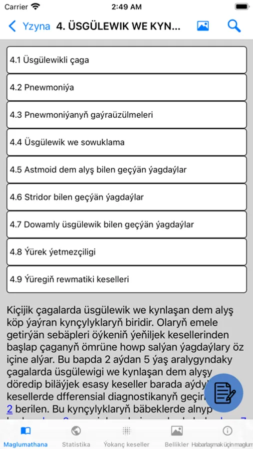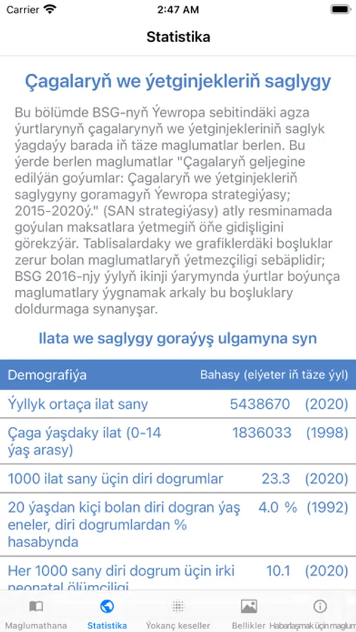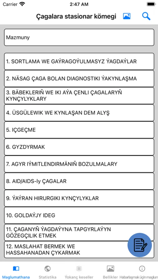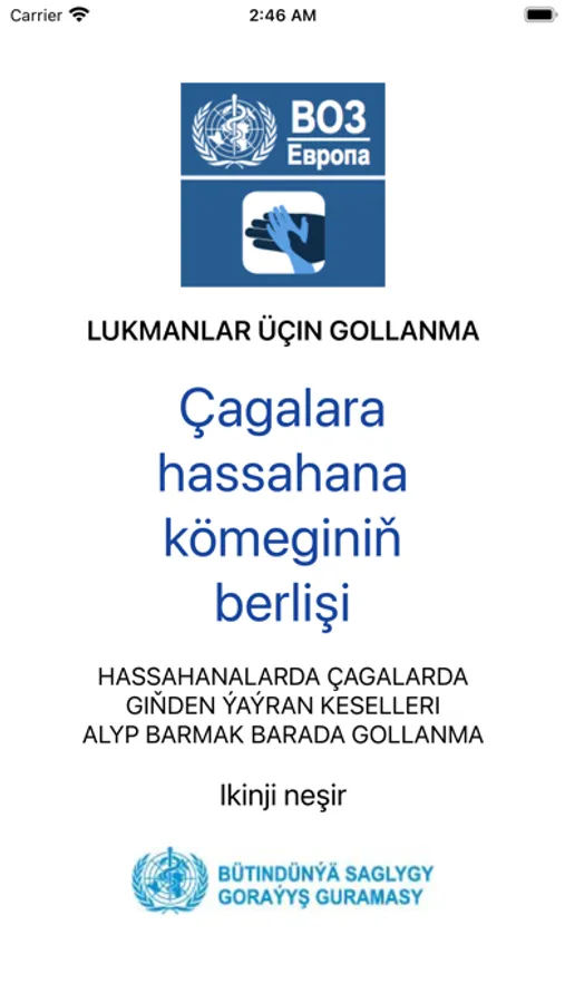 The application is an electronic version of pocket guide for children’s hospital care in Turkmen language. It is based on recommendations provided by WHO and has a mission to allow medical staff to have access to important information which can be needed to help children in hospitals (including recommendations on the stages of management of sick children in the hospital: emergency sorting assessment, methods of examination of children, laboratory tests, supportive care and monitoring, discharge and follow-up).