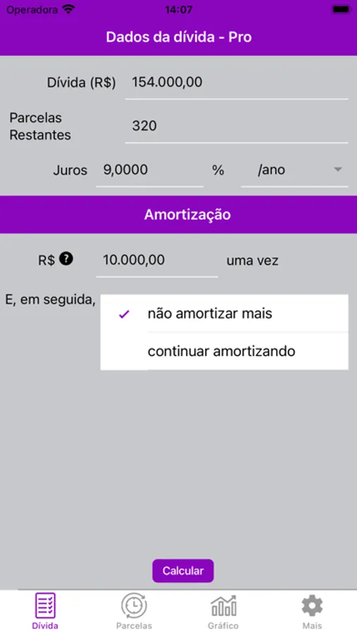 Pode-se simular um pagamento extra único ou repetindo de forma periódica (a cada mês, trimestre, semestre ou ano)
