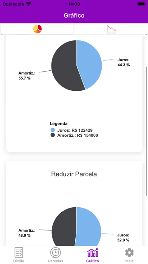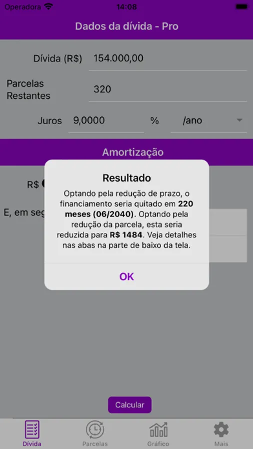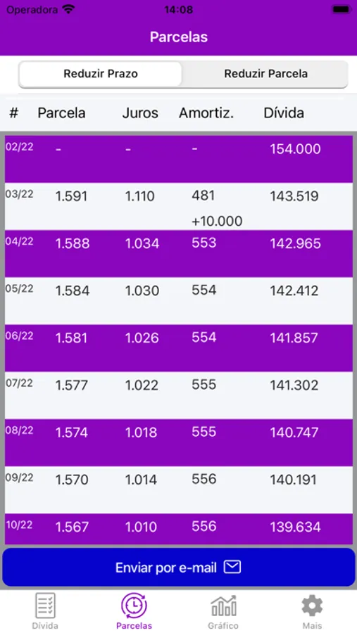 As novas parcelas (após a simulação da diminuição da dívida) são mostradas incluindo a estimativa de novo prazo