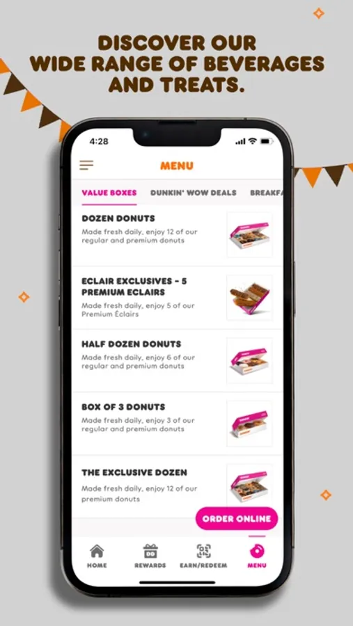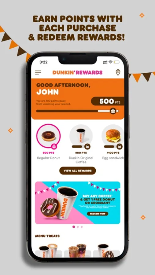 The Dunkin’ Rewards App allows you to earn points and redeem rewards, catch our daily exclusive deals, discover new products we add to our menu, share your feedback, and in case you need to visit us or get in touch, it helps you find the closest Dunkin’ branch to you.