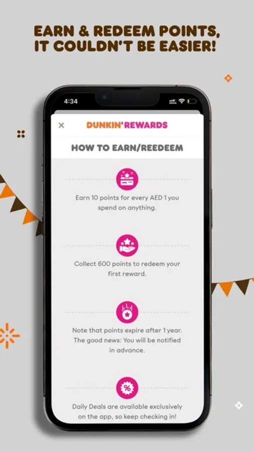 • Earn 10 points for every 1 AED you spend in our stores on any item at any Dunkin’ UAE branch. Those points can then be redeemed for a variety of free menu items anytime you want.