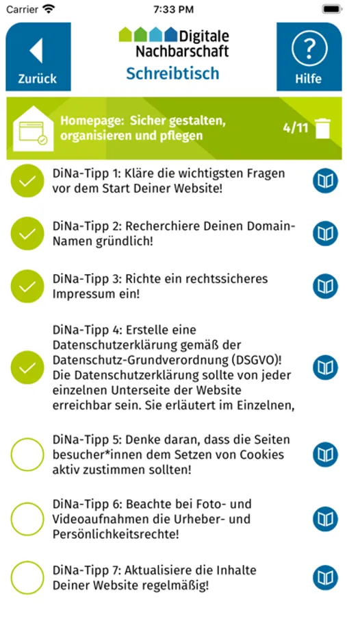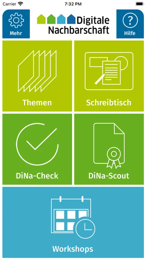 Immer griffbereit lassen sich die verschiedenen Themenwelten auf dem Smartphone oder Tablet durchstöbern. Mithilfe eines integrierten Schreibtischs wird Deine Arbeit strukturiert. So behältst Du immer den Überblick. Damit Du genau dort weitermachen kannst, wo Du aufgehört hast, werden Deine Fortschritte festgehalten. Ein Wissenstraining bietet die Chance, Dein Wissen regelmäßig zu testen. Du fühlst Dich bereit für den Scout-Test? Dann zertifiziere Dich in einem Online-Test zum Scout der Digitalen Nachbarschaft oder hol Dir als Auszeichnung für erfolgreiche Sicherheitsvorkehrungen den DiNa-Check für Deinen Verein.