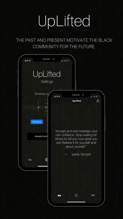 UpLifted is a motivational app with a curated collection of quotes made by the black community to motivate our community. It's important to share quotes from our past and present to motivate our future.