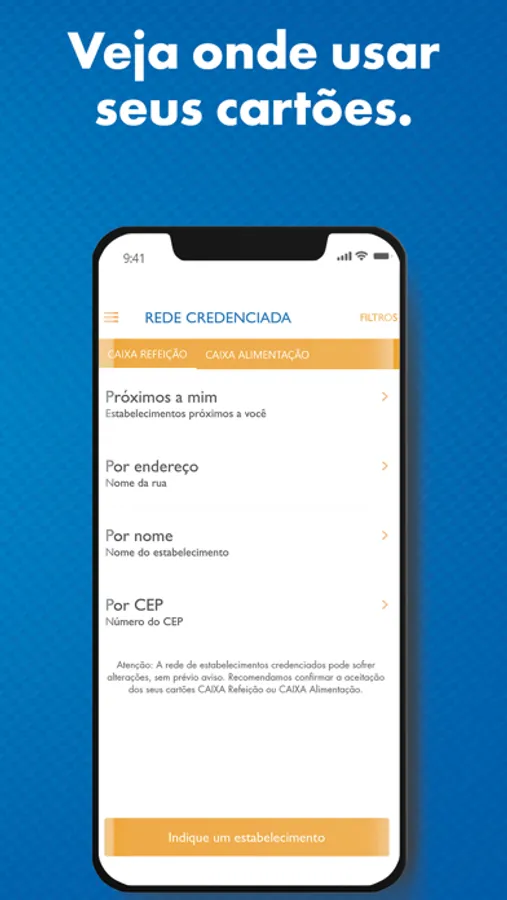 O CAIXA Refeição e Alimentação é um aplicativo onde você encontra tudo sobre o seu benefício. Além disso, o app conta com serviços e facilidades como: consulta de saldo, extrato, rede credenciada e muito mais. A cada compra, você recebe uma notificação confirmando o valor e se o seu estabelecimento favorito não aceitar o seu cartão, você pode indicá-lo pelo próprio aplicativo. Baixe grátis!