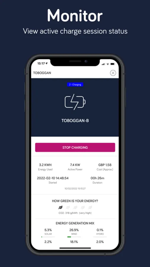 - Gain insights in to the carbon impact of your charging through our energy generation breakdown.