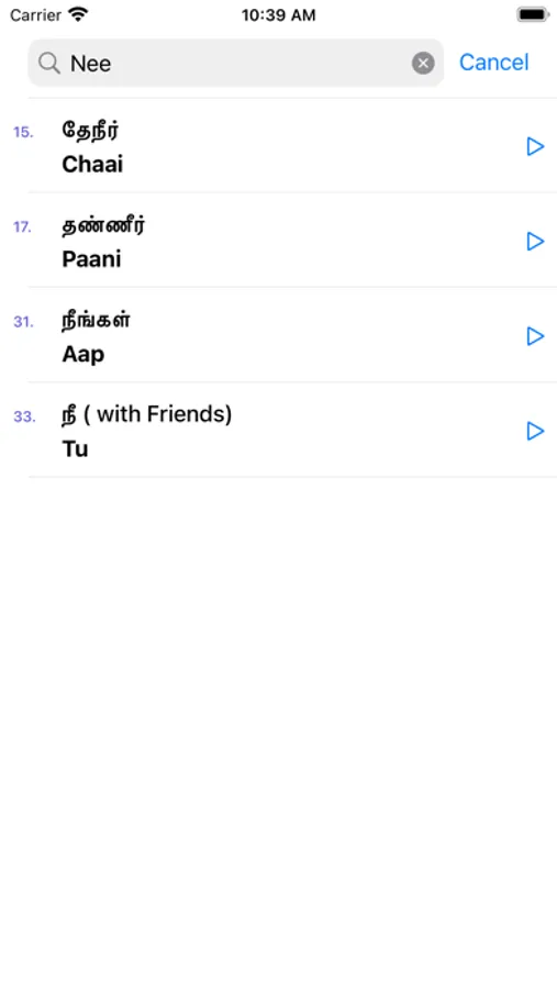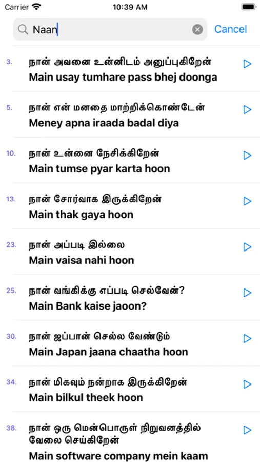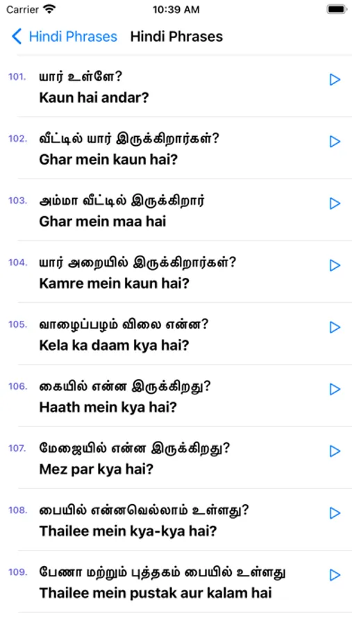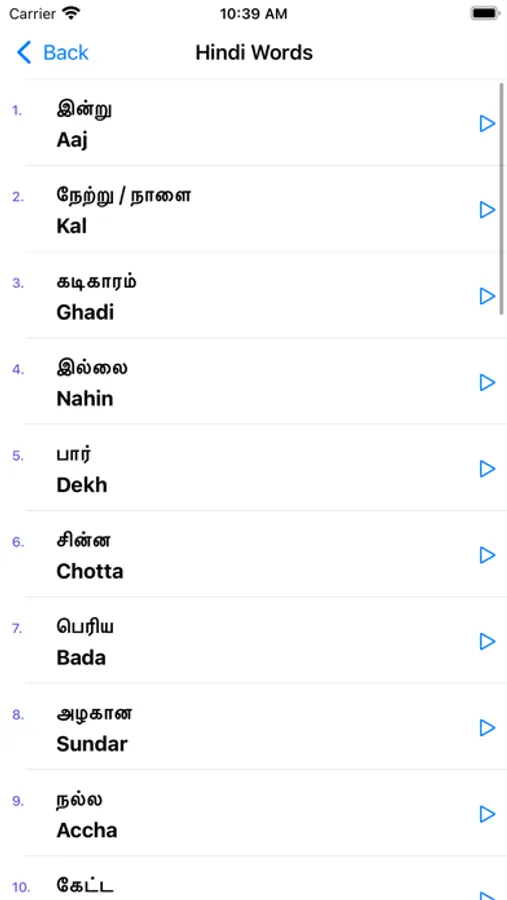 This app helps you to learn spoken Hindi through Tamil without having to learn Hindi letters. It has 500 Hindi words & 500 daily used Hindi sentences with audio, so you can successfully learn Hindi on your own by downloading this app.