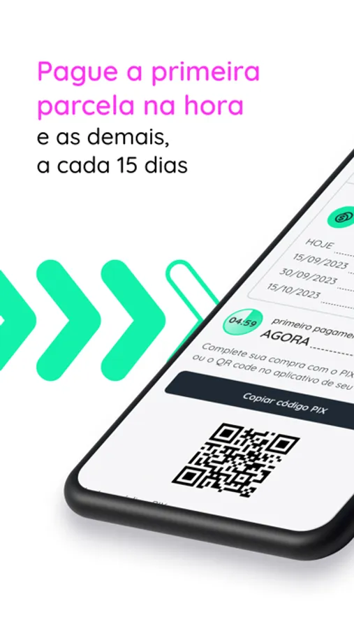 Ah, lembrando que, no momento da compra, você paga a primeira parcela e já pode receber seu produto. As demais parcelas você pode pagar depois, quinzenalmente.