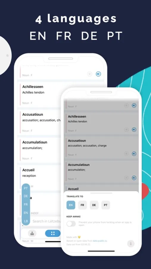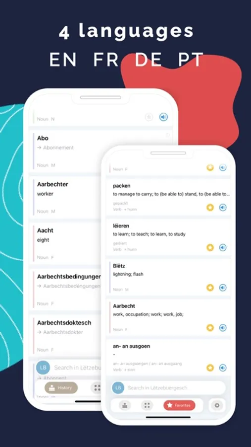 - Search for words in 5 languages: Luxembourgish, English, French, German and Portuguese.