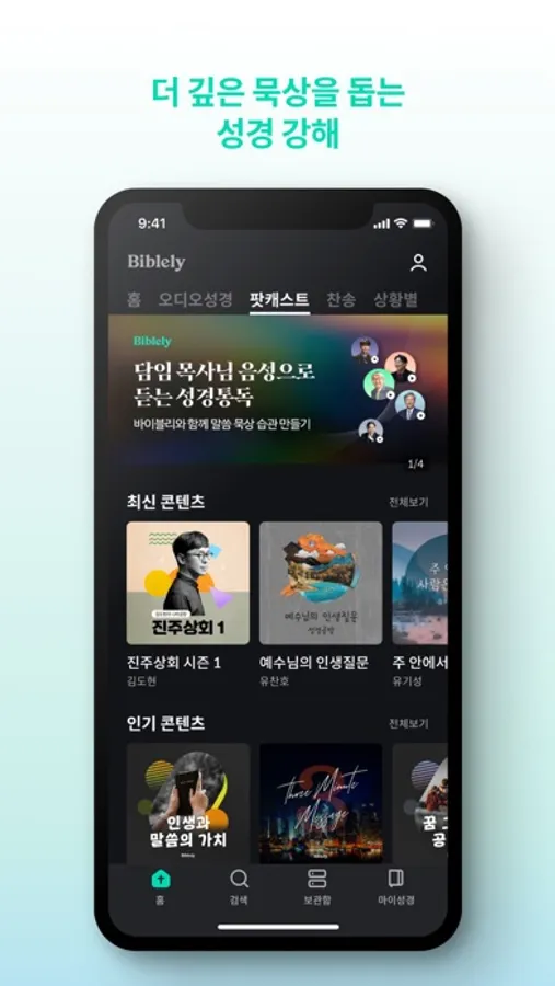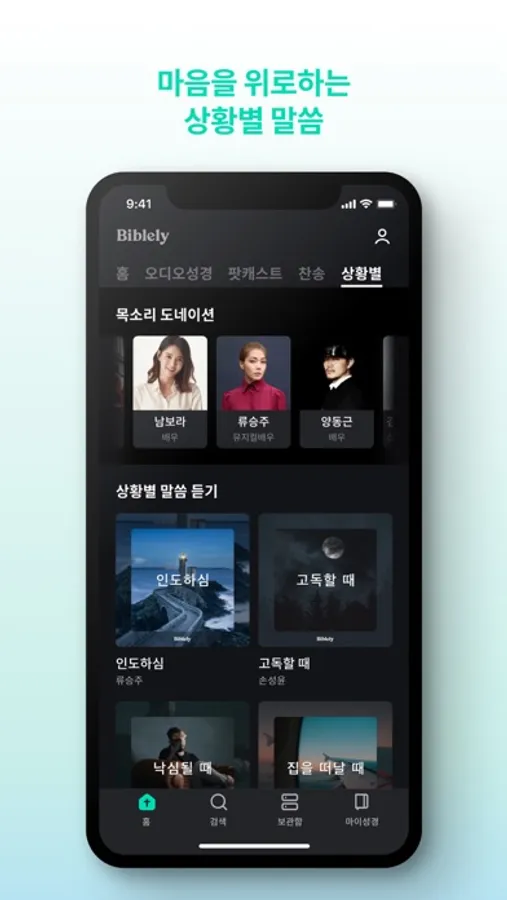 내 상황에 딱 맞는 성경 말씀을 듣다 보면, 하나님과 이 길을 동행하고 있음을 느낄 수 있어요.