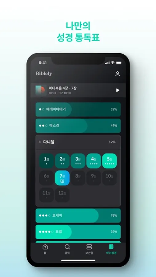성경 통독표를 체크하고 권, 장별로 목표 달성에 얼마나 가까워졌는지 쉽게 확인할 수 있어요.