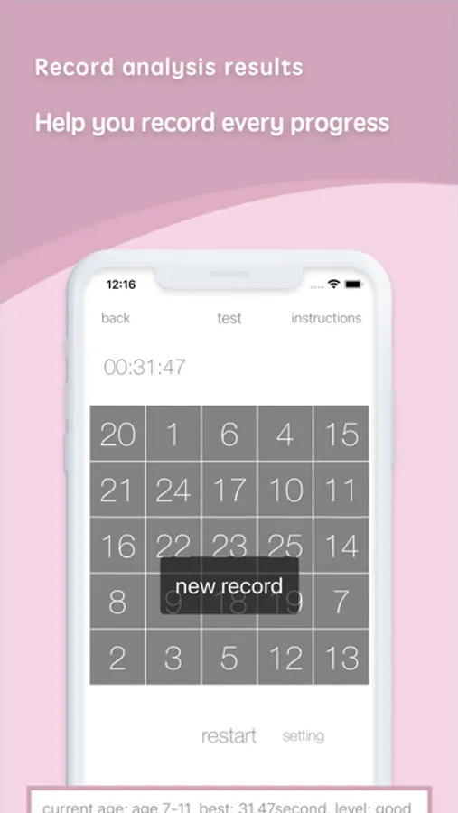 The longer you practice the Schulte grid, the less time it takes to look at your watch. With the deepening of the practice, the students' visual perception ability is improved. Beginners can effectively expand the visual width, exercise the eyes to recognize and read quickly, and speed up the reading speed; the training also expands the visual breadth. Effect.