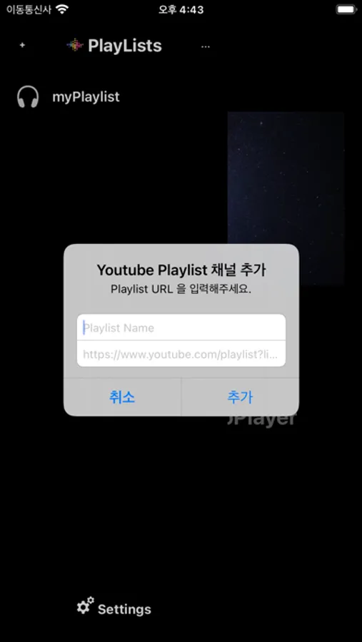 무료로 공개된 youtube playlist 를 추가하여 음악 감상을 해보세요.
