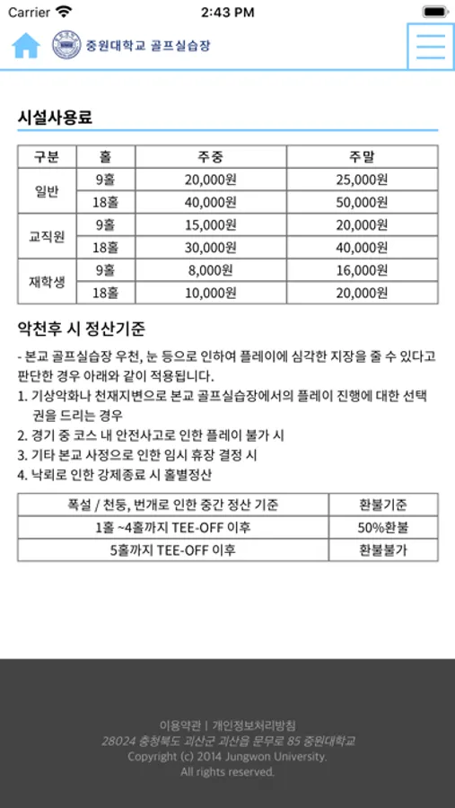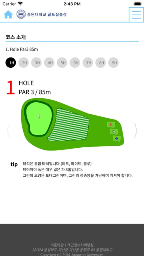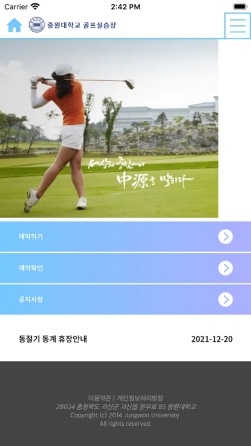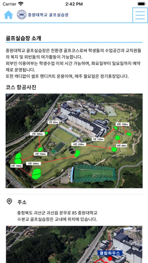 중원대학교 골프실습장은 국내 유일 대학캠퍼스 내 친환경 셀프 골프코스로써 학생들의 수업공간과 교직원들의 복지 및 외빈들의 여가활동이 가능합니다.