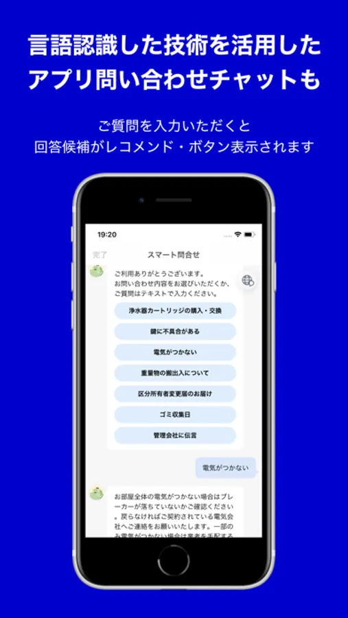 いつでも、どこでもお住まいの管理に関するお問い合わせにボタンやテキスト形式でお答えいたします。