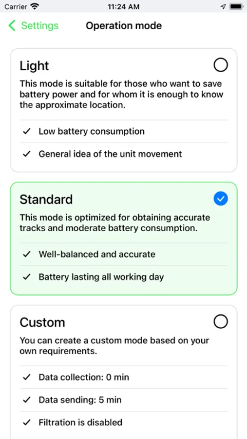The application supports choosing a user mode from preset ones or creating your own with settings depending on the goals of monitoring. A wide range of settings available allows receiving accurate data while reducing traffic and battery consumption.