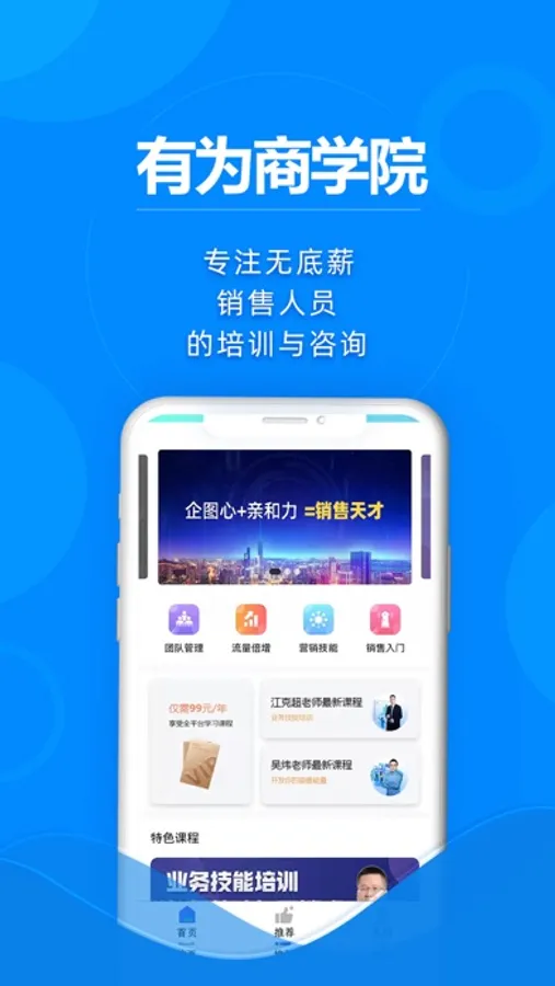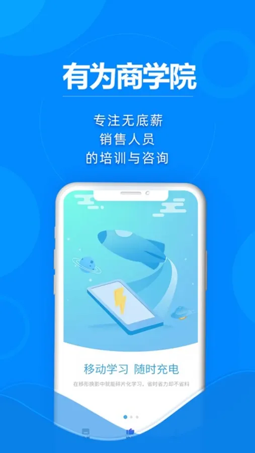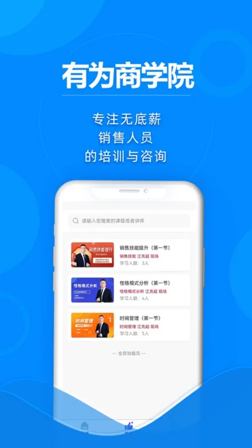 有为商学院以在线视频的方式,让用户学习到营销实战、商业素养、商业思维、销售能力、服务能力等轻创业必备知识。
