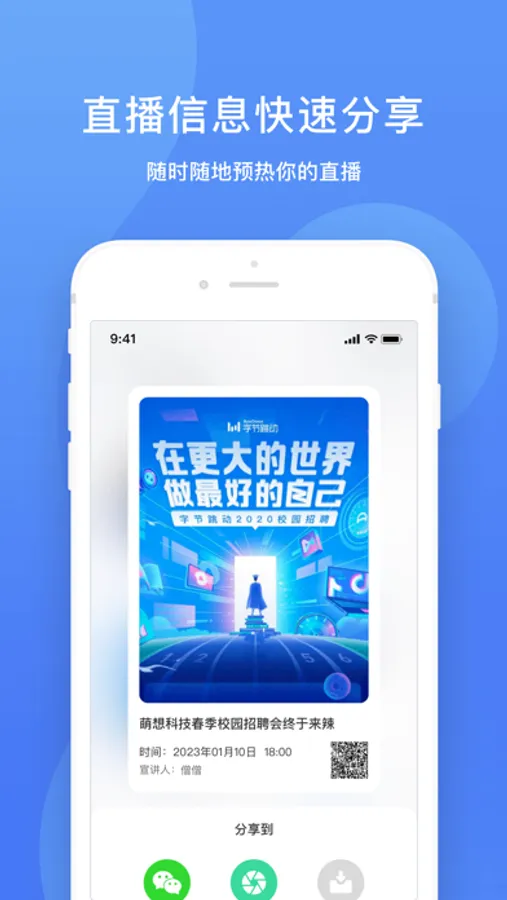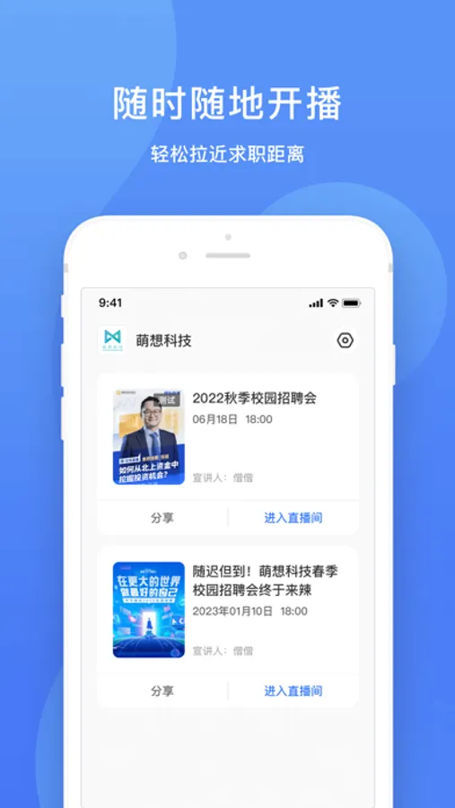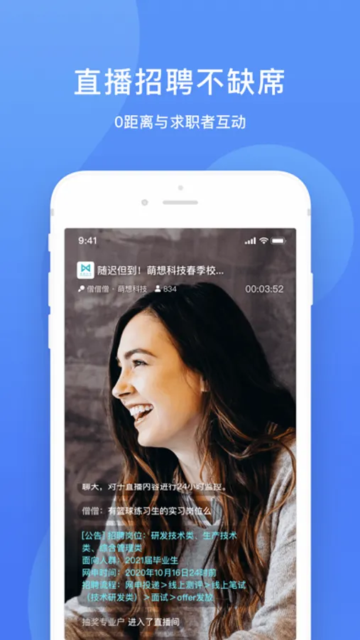 实习僧招聘端致力于让企业招聘更简单、更高效,为企业提供快捷便利的线上直播工具,一键即可开播,帮助企业快速沉淀人才资源。