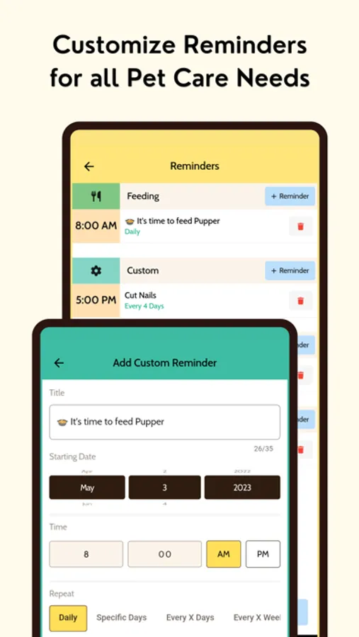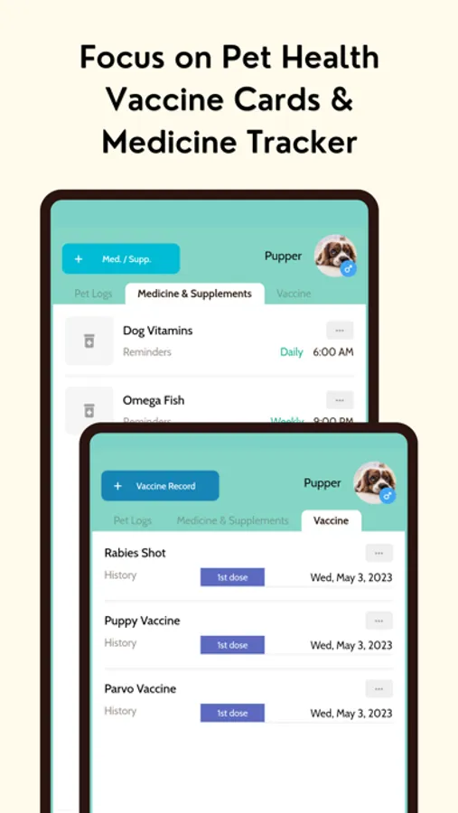 Custom Pet Reminders and Medicine, Vitamin Supplement Tracker for dogs cat, and general small pets. We also support reptiles and bird