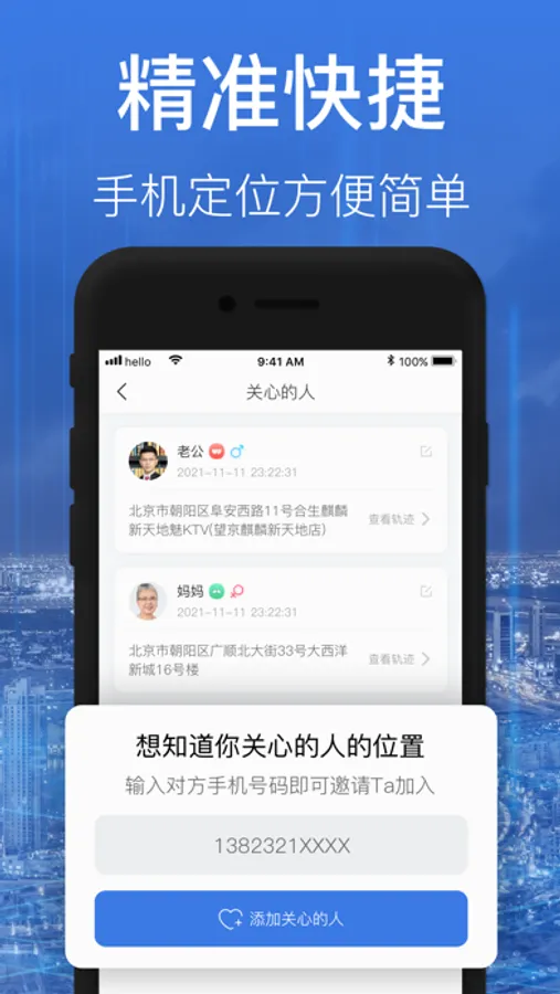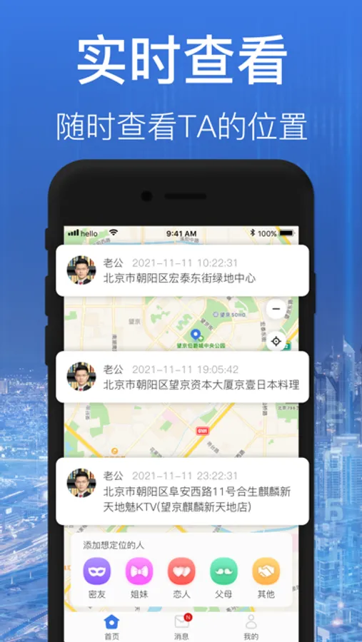 精准定位:在地图上精准定位查找伴侣、家人、好友、孩子的实时位置信息。
