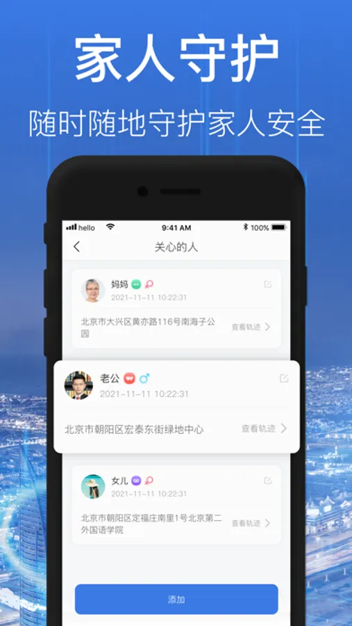 守护家人:添加亲人、好友,可实时共享位置,轻松找到并守护她/他。