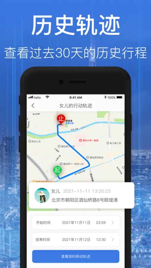 历史轨迹:清晰便捷查询过去30天的历史移动轨迹地图,让每个出门在外的人都能安全到家。