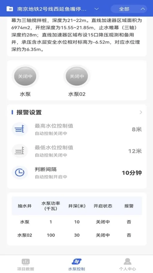 主要应用在基坑降水领域,可以实现观测井水位自动监测,自动生成水位数据曲线和表格,可以查看任一时间段的水位历史数据。可以设定水位报警值,水位过高或过低时报警,自动发送报警短信,并自动开启或关停抽水井的水泵。