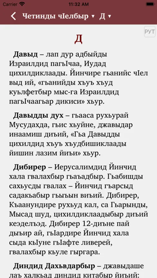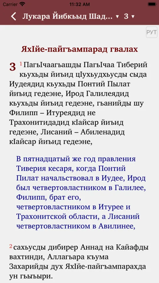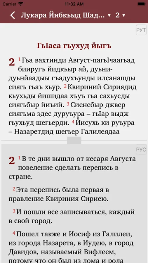 It facilitates the offline study of the Scriptures in Rutul. It also contains the Russian Synodal translation, which can optionally be displayed in parallel. Users can highlight verses in different colors, place bookmarks, write notes and view the reading history.