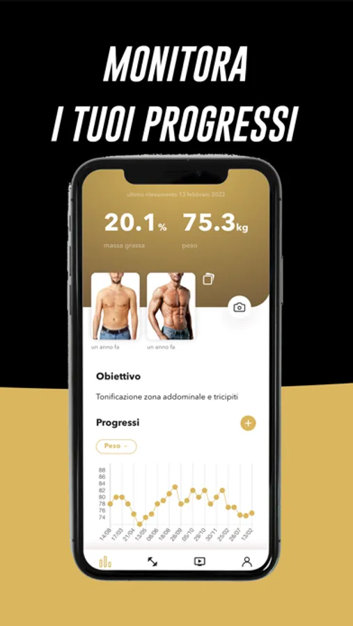 Avrai sempre sotto controllo la tua attività fisica: potrai visualizzare quali esercizi sono previsti nel tuo piano di allenamento, i tuoi progressi e come cambia il tuo fisico nel corso del tempo.
