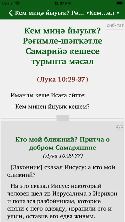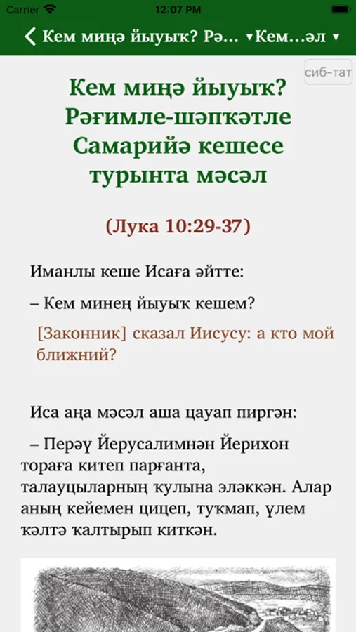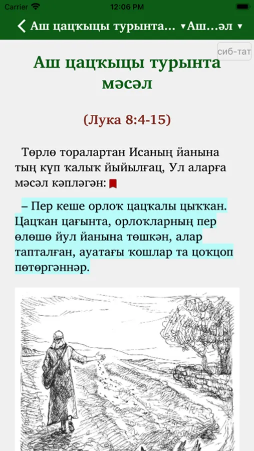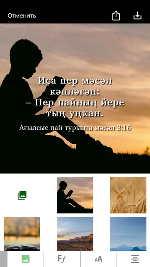 This Scripture app facilitates Bible study in the Siberian Tatar language. Users can highlight the text with different colors, make bookmarks, write notes and view their reading history. The Russian Synodal translation can optionally be added in parallel or in verse-by-verse mode to the Siberian Tatar text. The app includes a verse-on-image editor, which means that parts of the text can be placed on the background of a picture from the app gallery or from the user’s smartphone memory and shared via email or social networks.
