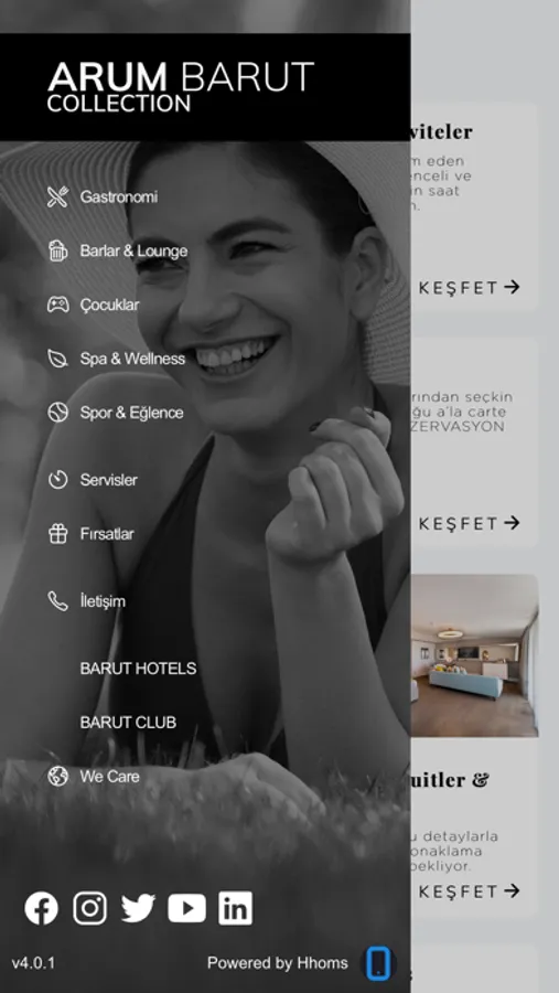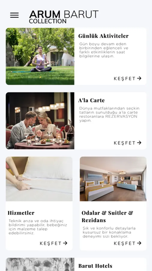 Arum App mobil uygulamamız üzerinden bir çok hizmete kolayca erişebilir, konaklamanızın daha eğlenceli ve konforlu geçmesini sağlayabilirsiniz. Günlük aktivitelerden, otel restoranlarının menülerine kadar bir çok bilgiye kolaylıkla ulaşabilirsiniz.