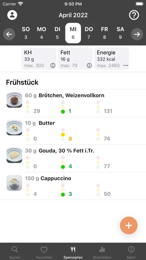 • Mengeneingabe in Gramm oder in üblichen Portionen