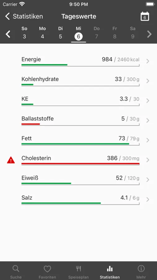Kalorien, Eiweiß, Kohlenhydrate, Fett, Kochsalz, Ballaststoffe, KE (Kohlenhydrat-Einheit), Cholesterin