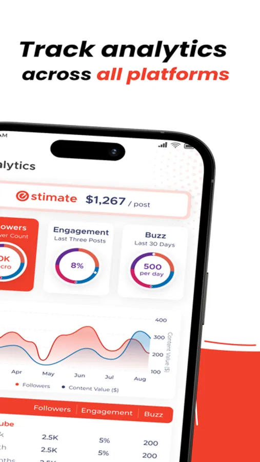 • View total follower count, average engagements, and daily buzz for yourself or other influencers on the platform