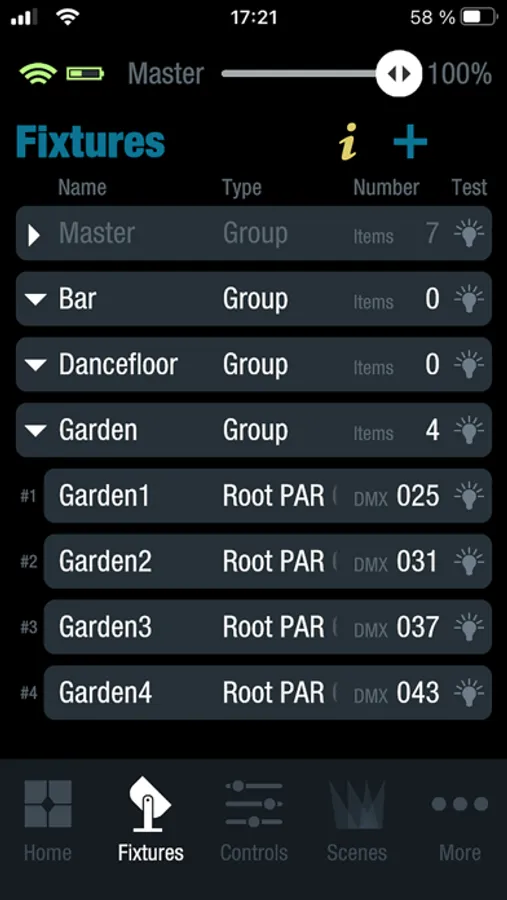 Arrange fixtures in groups, create custom colours, generate effects and activate up to eight of them in parallel. The Cameo iDMX® APP supports a full DMX universe of 512 channels and all RGB, RGBA, RGBW, RGBWA, RGB+UV and RGBWA+UV lightsfixtures. It includes a timer to start and stop your lighting performance automatically.