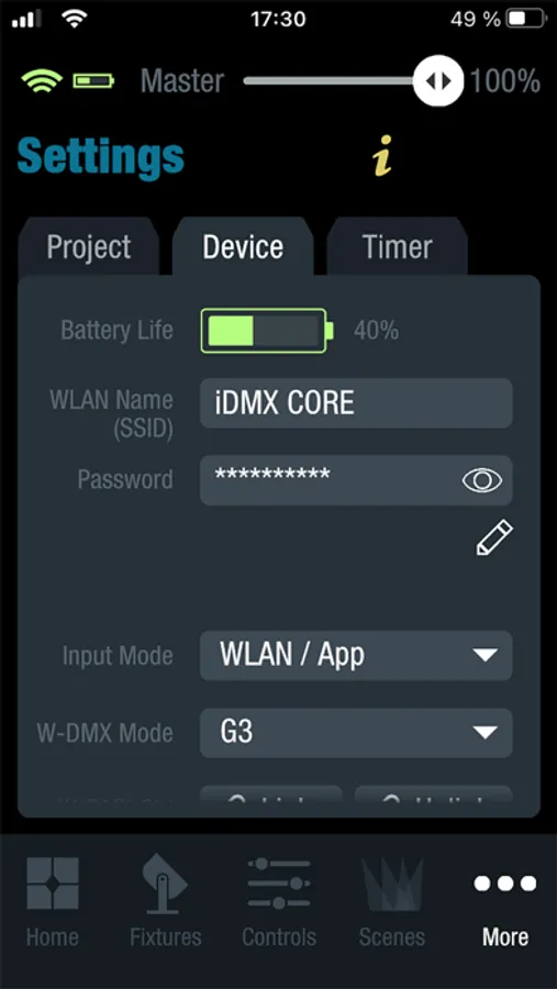 The iDMX® APP requires Cameo’s iDMX® CORE interface. This battery powered WiFi receiver integrates a 2.4 GHz W-DMX™ transmitter with up to 300 m operating range. It allows you to control both standard DMX and W-DMX™ enabled fixtures with the app.