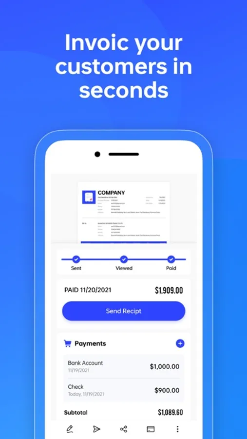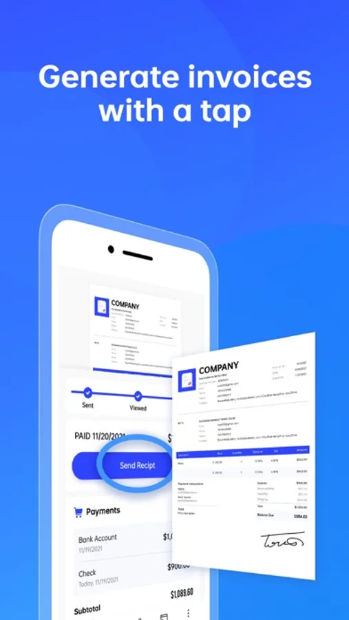 Creating a professional invoice or estimate takes you just a few seconds and a couple of taps, as you save all details of your product or service —description, price and more. Convert estimates to invoices with one tap.
