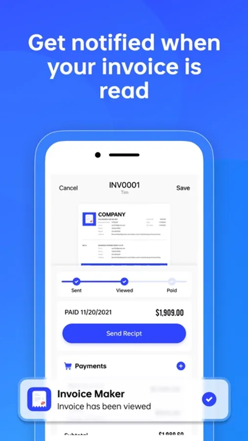 With Invoice Maker, you can add as much or as little detail as you need. Include payment information, due dates, photos, discounts, shipping details, signatures, and more. Deliver via email, text or print. You can even get notified when the customer reads your invoice.