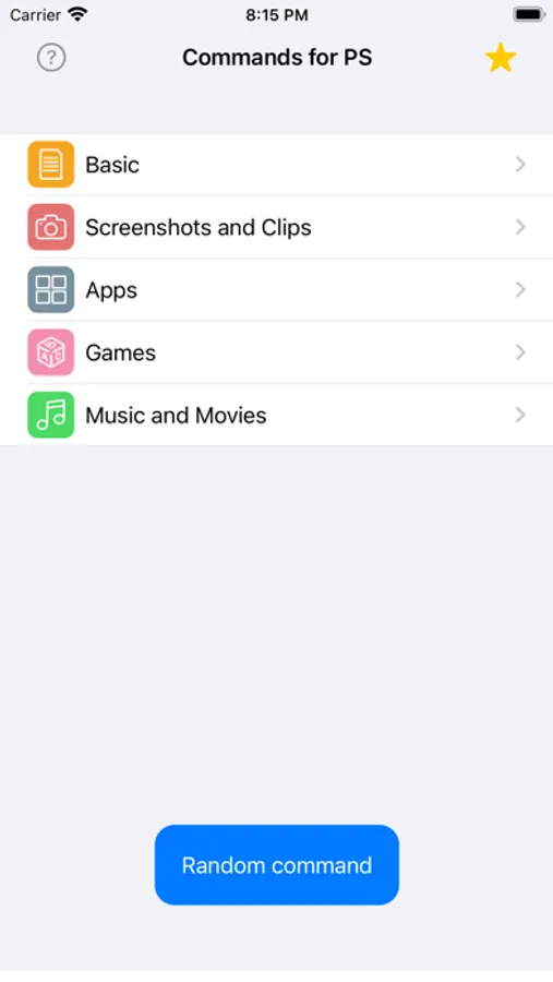 This app provides a full list of voice commands for Play Station (PS). The commands are divided into categories.