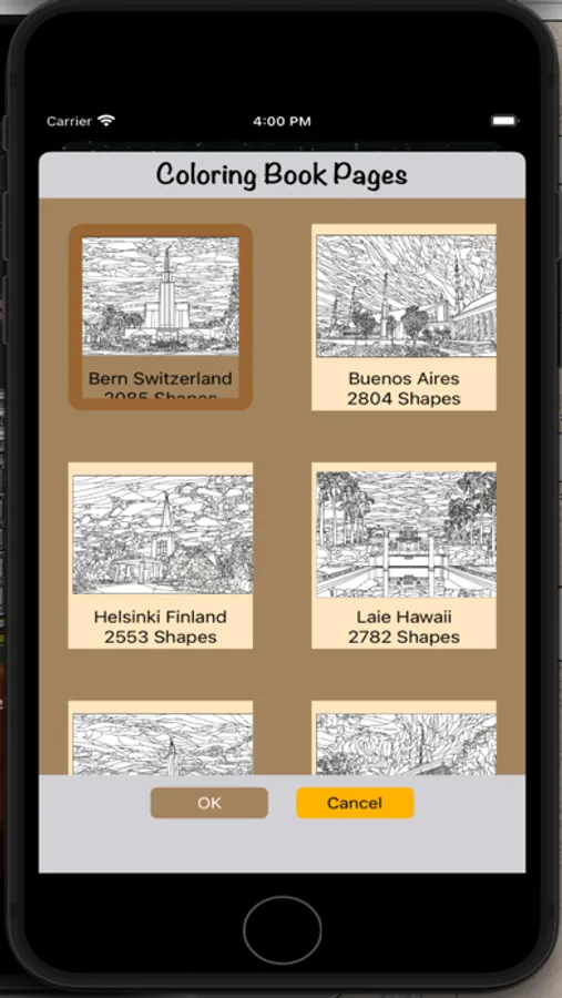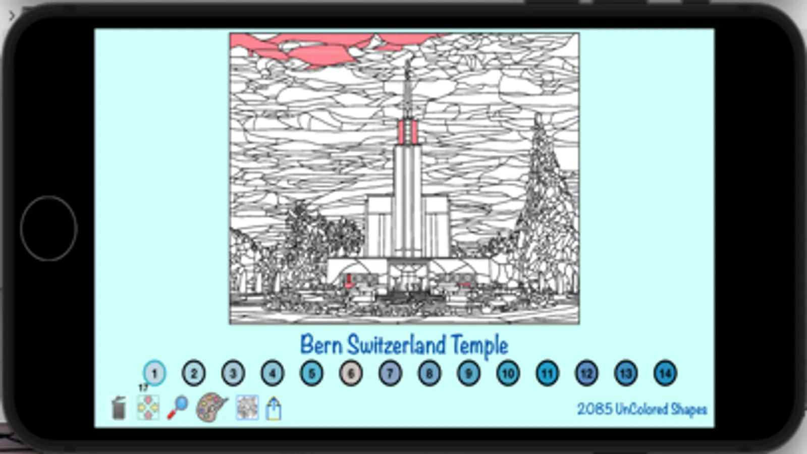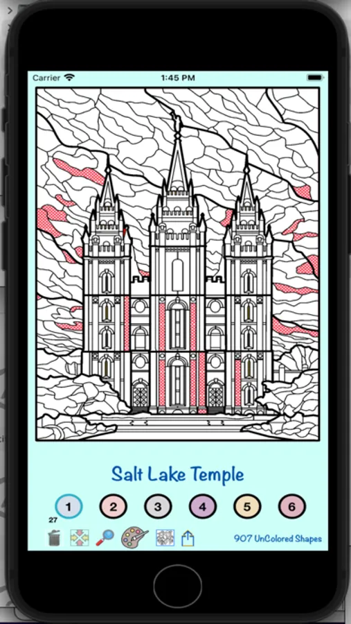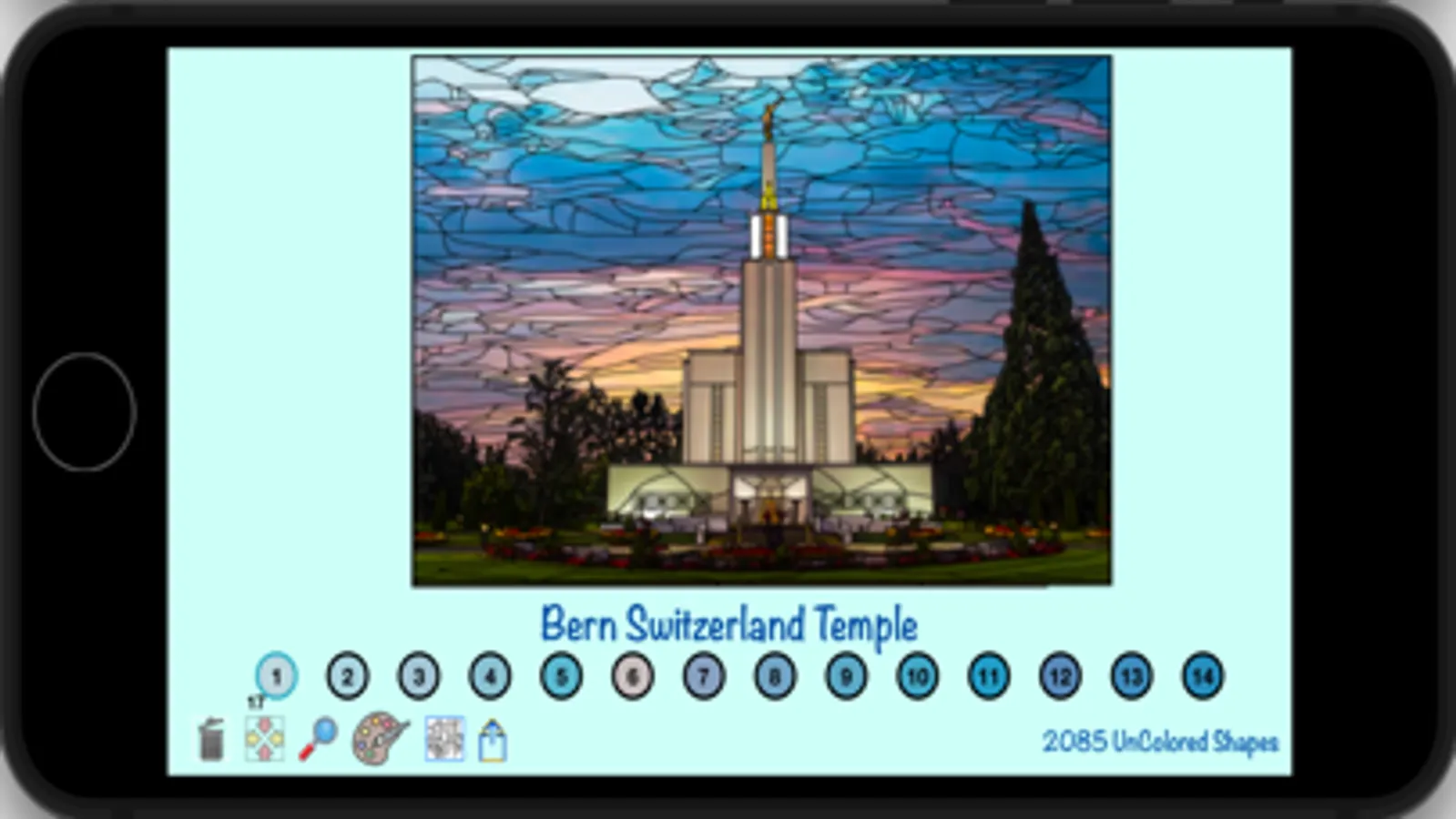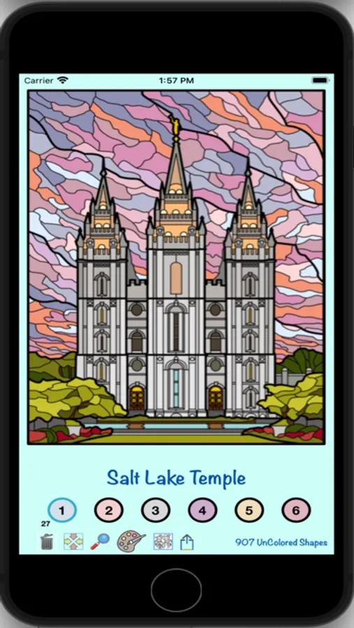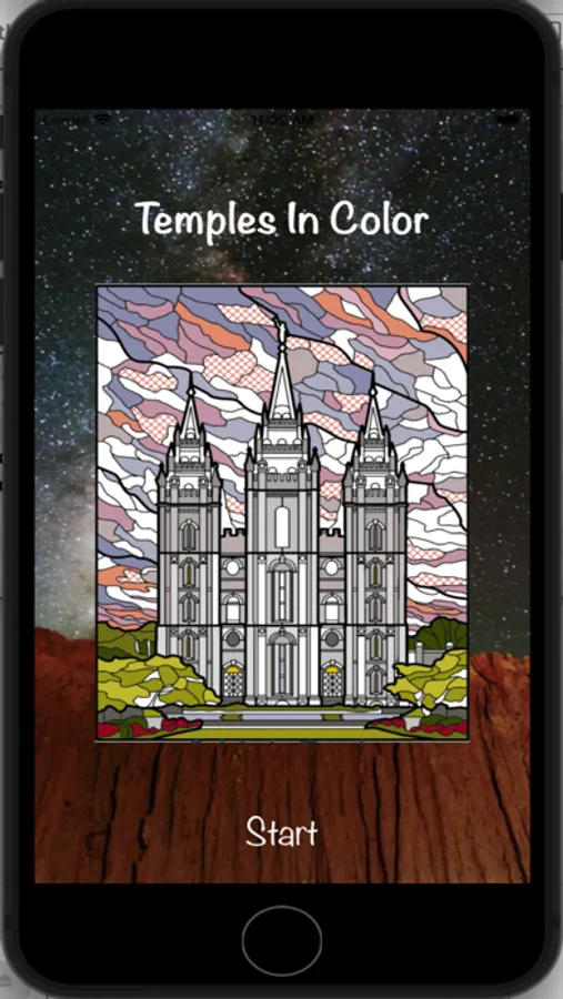 The temples included in the first release of the app are temples for the Church of Jesus Christ of Latter-Day Saints, but additional temples from around the world will be included in a subsequent release of the app. The number of shapes to be colored in the different temples ranges from approximately 1000 to 4000. The resulting colored images have a stain glass appearance, and can be shared with family and friends.