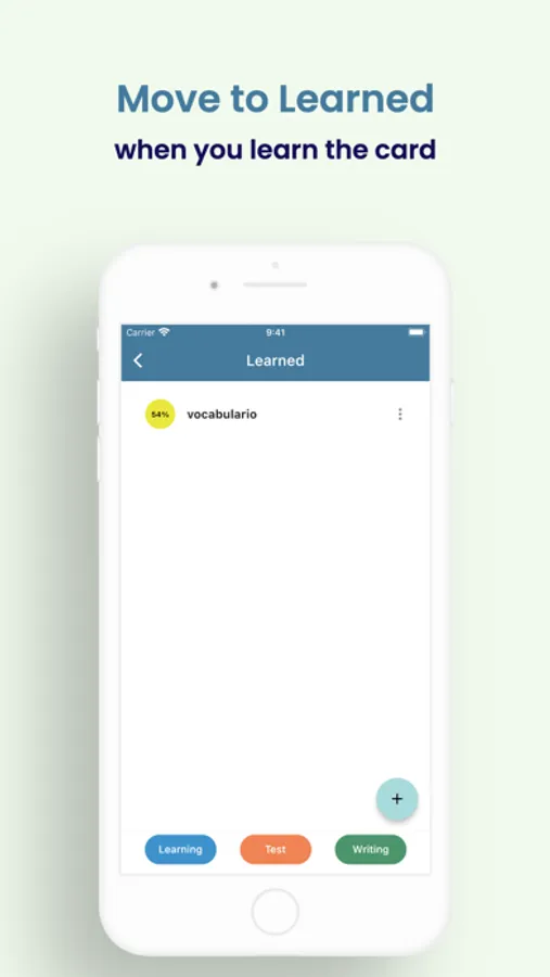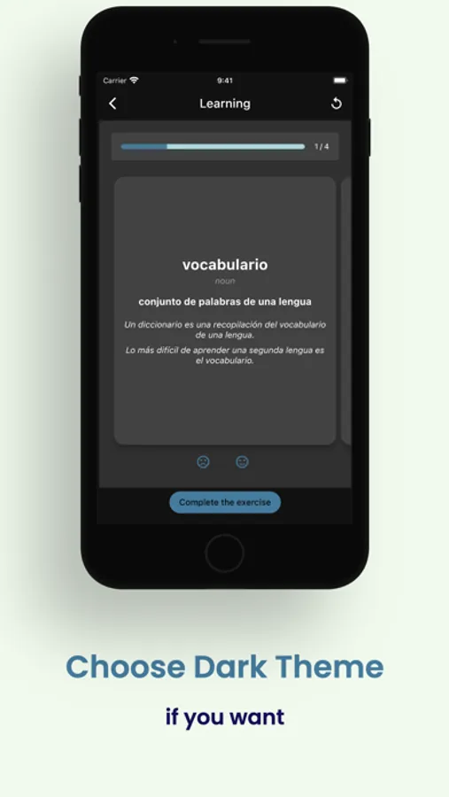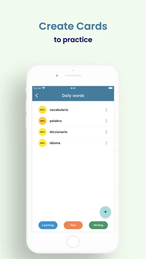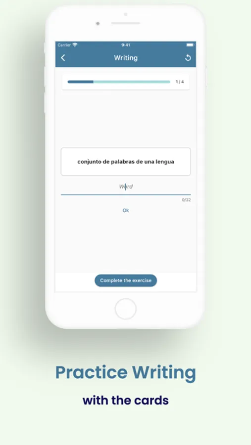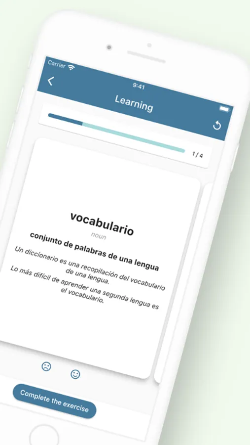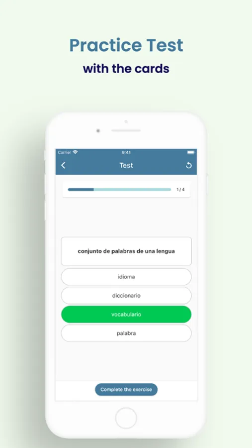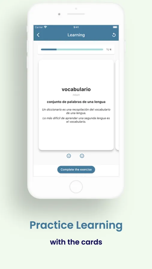 You can do exercises with the cards in the deck. There are 3 types of exercise. Try to guess the word by looking at the definition with the learning exercise, try to choose the right word among 4 options by looking at the definition with the test exercise and try to write the word correctly by looking at the definition with the writing exercise.