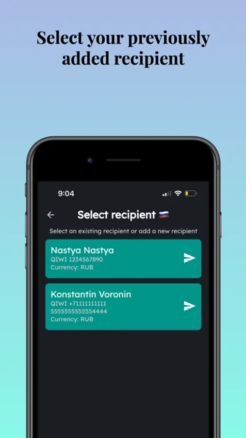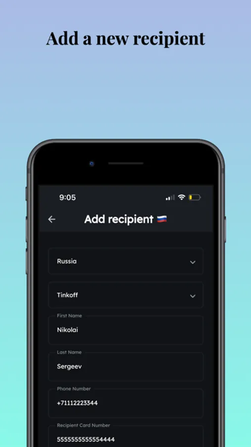 Transfers through Sendnomad are not subject to bank commissions, so they are very beneficial for the recipient. The sender always sees the total amount to be credited and the exchange rate before sending.