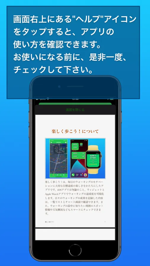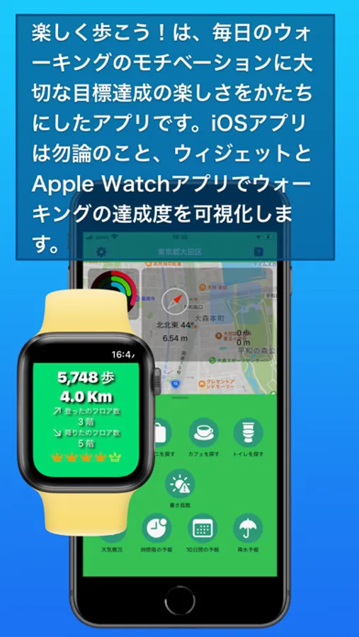 楽しく歩こう!は、毎日のウォーキングのモチベーションに大切な目標達成の楽しさをかたちにしたアプリです。iOSアプリは勿論のこと、ウィジェットとApple Watchアプリでウォーキングの達成度を可視化します。日々のウォーキングの成果を記録した内容は、一覧リストとチャート画面で確認できます。また、ウォーキングの最中に知りたい周囲のスポット情報や天気概況などもその場でスマートにチェックできます。