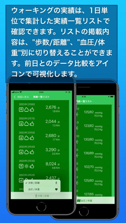 ウォーキングの実績は、1日単位で集計した実績一覧リストで確認できます。リストの掲載内容は、"歩数/距離"、"血圧/体重"別に切り替えることができます。前日とのデータ比較をアイコンで可視化します。